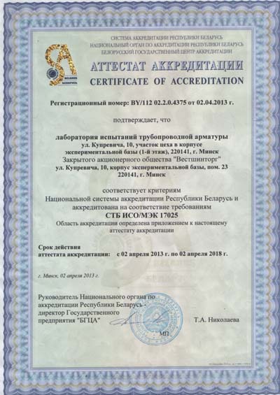 ЗАО "Международный маркетинговый центр "Трубопроводная арматура и оборудование” имеет - лабораторию испытаний трубопроводной арматуры