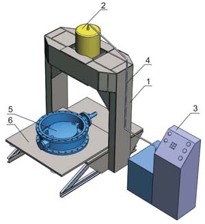 1 - Корпус пресса 2 - Гидроцилиндр 3 - Гидростанция с блоком управления 4 - Подводка 5 - Испытуемая арматура 6 - Подвижной стол |